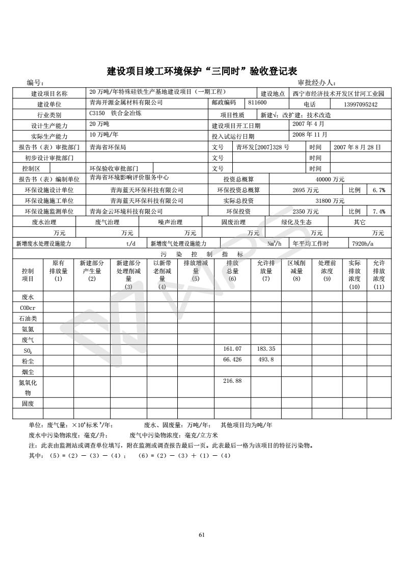 2018年1月11日,青海開源金屬材料有限公司組織召開20萬噸/年特殊硅鐵生產(chǎn)基地建設(shè)項目(一期工程)竣工環(huán)境保護驗收會。 青海開源金屬材料有限公司20萬噸特殊硅鐵生產(chǎn)基地建設(shè)項目(一期工程)驗收組意見.