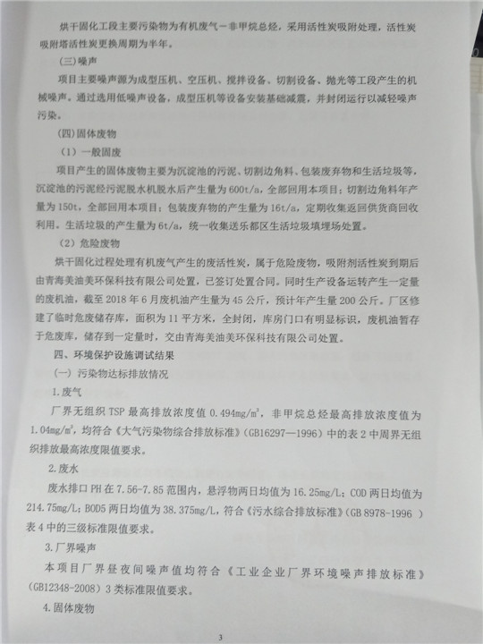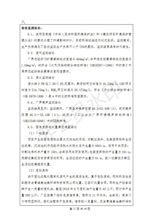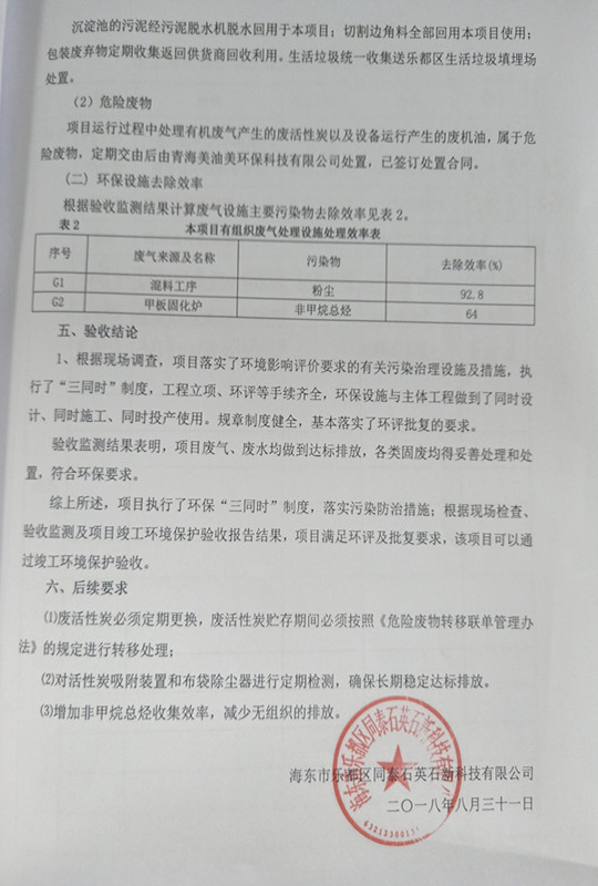 根據(jù)中華人民共和國(guó)國(guó)務(wù)院令第253號(hào)《建設(shè)項(xiàng)目環(huán)境保護(hù)管理?xiàng)l例》(中華人民共和國(guó)國(guó)務(wù)院令第682號(hào)《國(guó)務(wù)院關(guān)于修改〈建設(shè)項(xiàng)目環(huán)境保護(hù)管理?xiàng)l例〉的決定》和《建設(shè)項(xiàng)目竣工環(huán)境保護(hù)驗(yàn)收暫行辦法》,嚴(yán)格依照有關(guān)法律法規(guī),建設(shè)項(xiàng)目環(huán)境保護(hù)設(shè)施驗(yàn)收技術(shù)規(guī)范,本項(xiàng)目環(huán)評(píng)報(bào)告表和環(huán)保審批部門(mén)審批意見(jiàn)以及企業(yè)自行驗(yàn)收相關(guān)要求等對(duì)本項(xiàng)目進(jìn)行驗(yàn)收,本項(xiàng)目符合環(huán)保驗(yàn)收條件,可以通過(guò)環(huán)保驗(yàn)收。 海東市樂(lè)都區(qū)同泰科技有限公司竣工環(huán)境保護(hù)驗(yàn)收監(jiān)測(cè)報(bào)告公示