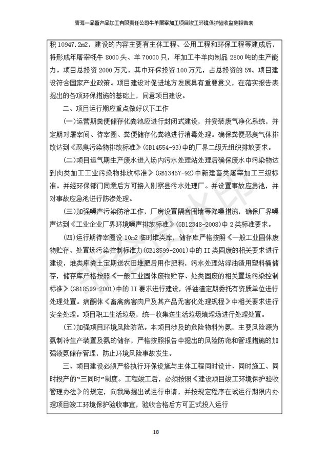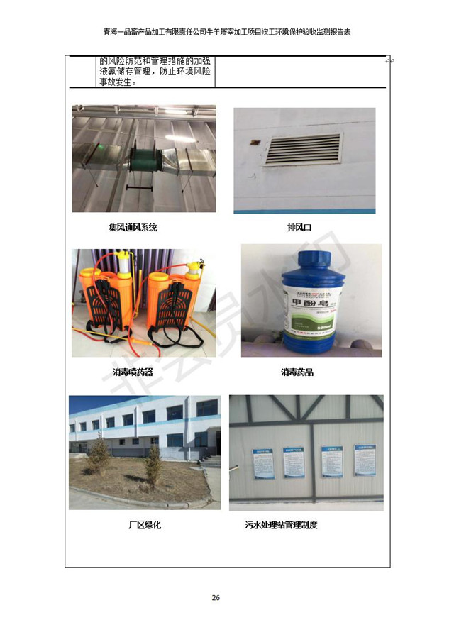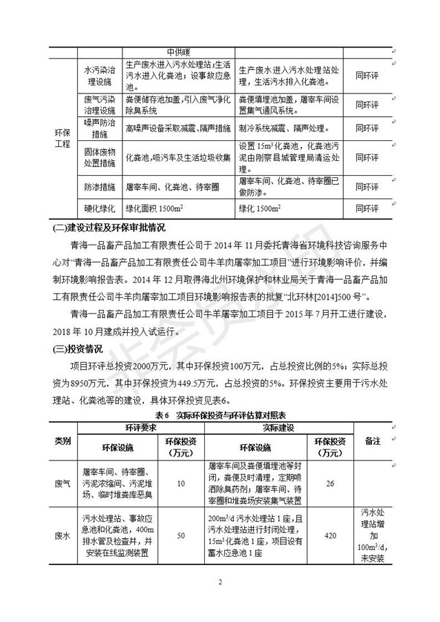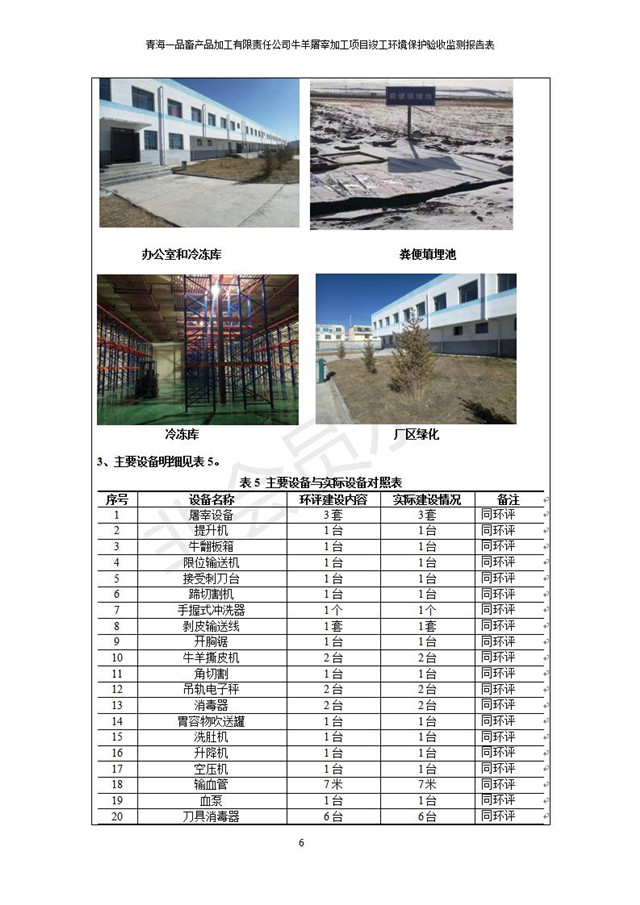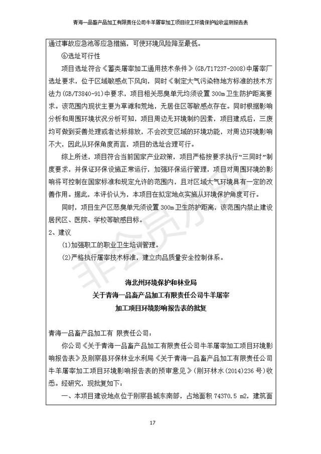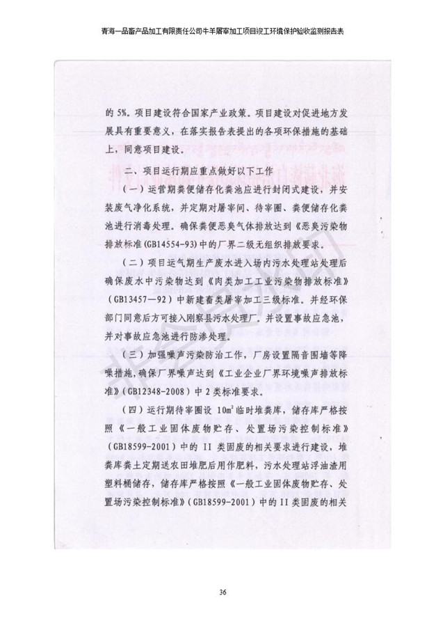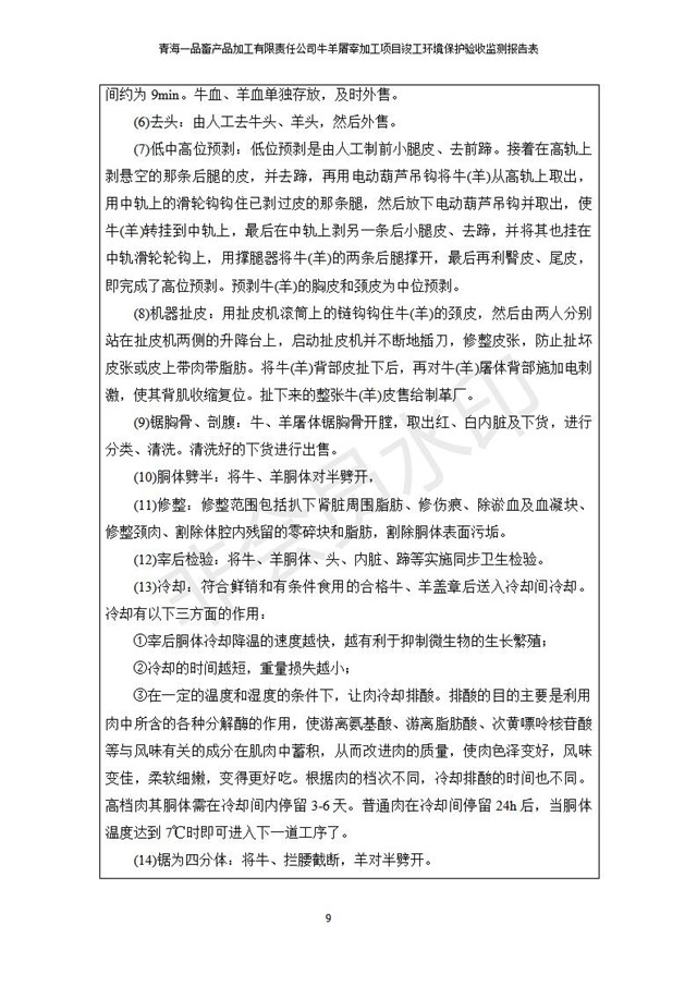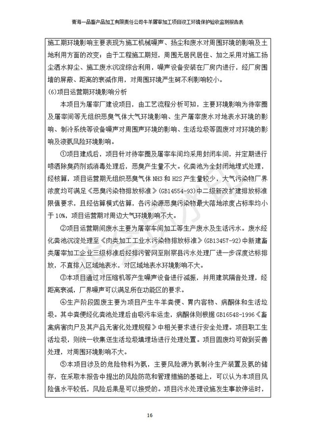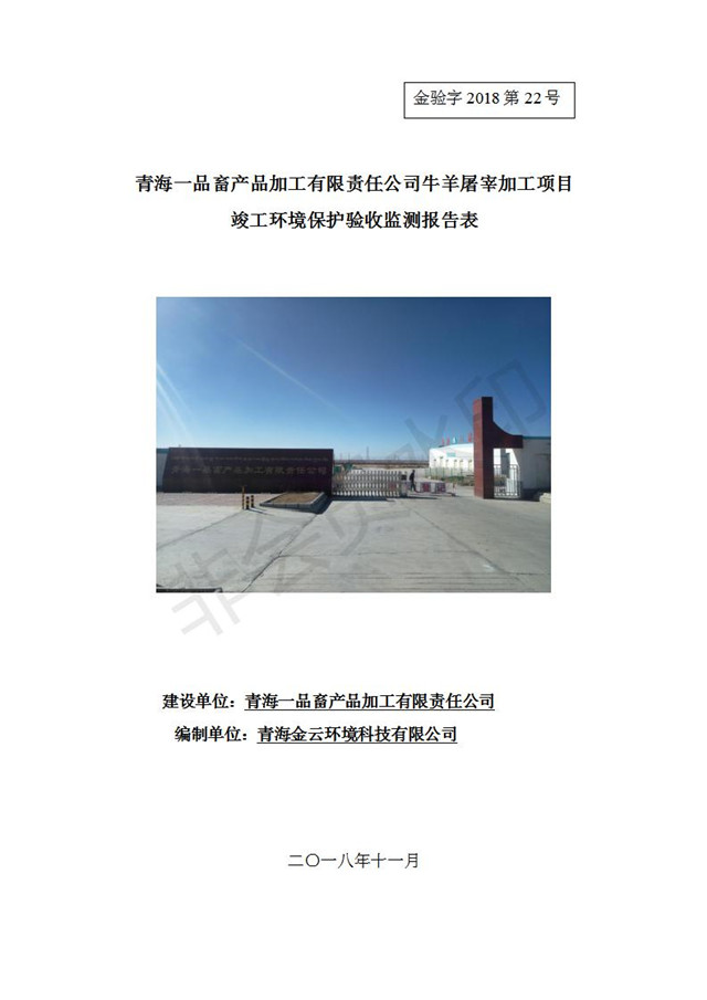 根據(jù)中華人民共和國國務(wù)院令第682號《國務(wù)院關(guān)于修改〈建設(shè)項目環(huán)境保護(hù)管理條例〉的決定》和《建設(shè)項目竣工環(huán)境保護(hù)驗收暫行辦法》(國務(wù)院令682號),青海一品畜產(chǎn)品加工有限責(zé)任公司牛羊屠宰加工項目(包括竣工環(huán)境保護(hù)驗收監(jiān)測報告表和驗收意見)公示如下。 一、項目名稱:青海一品畜產(chǎn)品加工有限責(zé)任公司牛羊屠宰加工項目竣工環(huán)境保護(hù)驗收監(jiān)測報告表 二、地點:剛察縣縣城東大街加油站東側(cè) 三、建設(shè)單位:青海一品畜產(chǎn)品加工有限責(zé)任公司 四、建設(shè)內(nèi)容:項目地面積17453m2,項目建設(shè)內(nèi)容包括牛羊屠宰車間、牛羊肉加工車間、冷庫、辦公區(qū)、污水處理站等。 五、聯(lián)系人:張工 七、公示時間:二〇一九年一月十一日至二〇一九年二月七日 公示期間,對上述公示內(nèi)容如有異議,請以書面形式反饋,個人須署真實姓名,單位須加蓋公章。