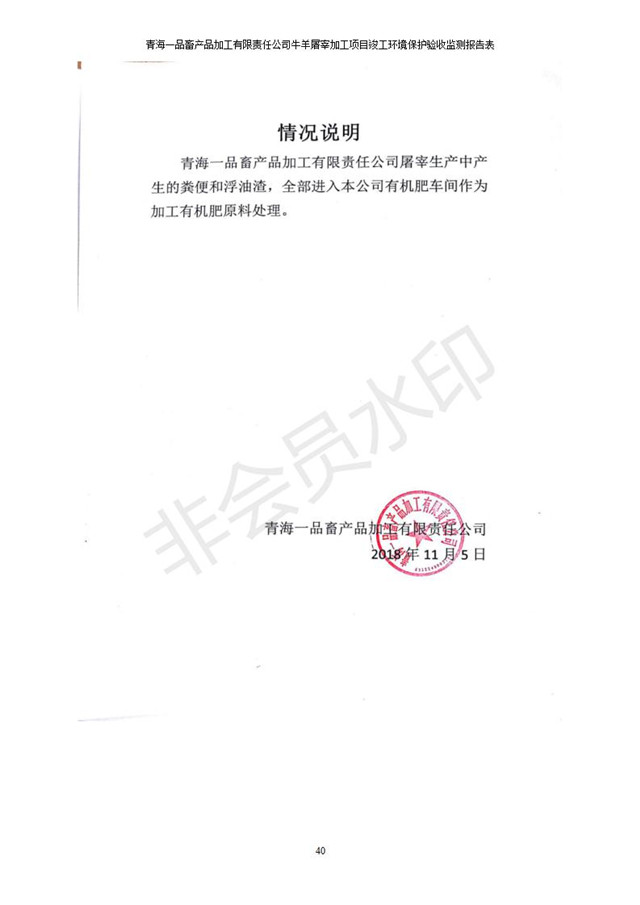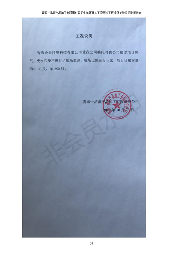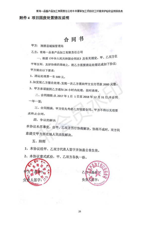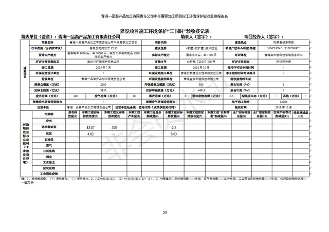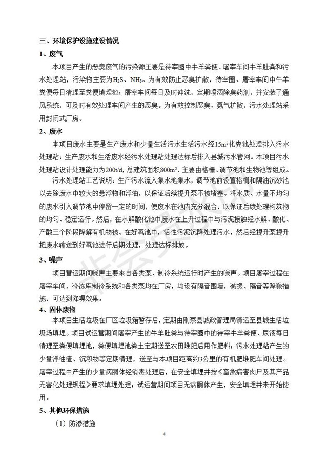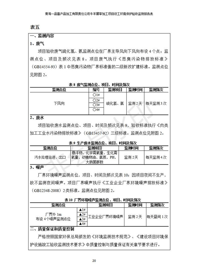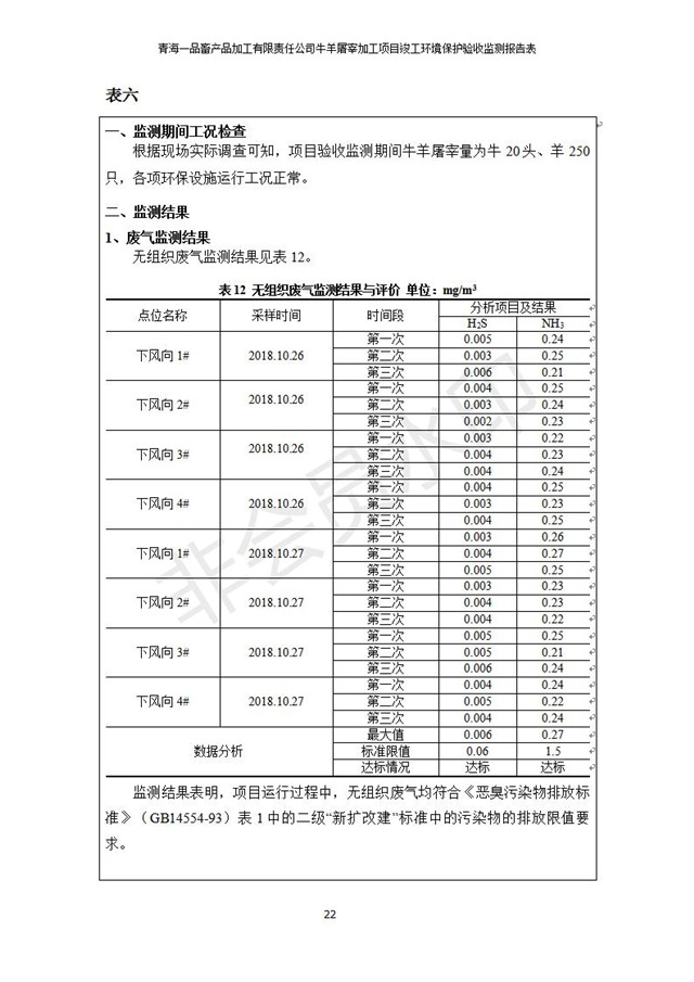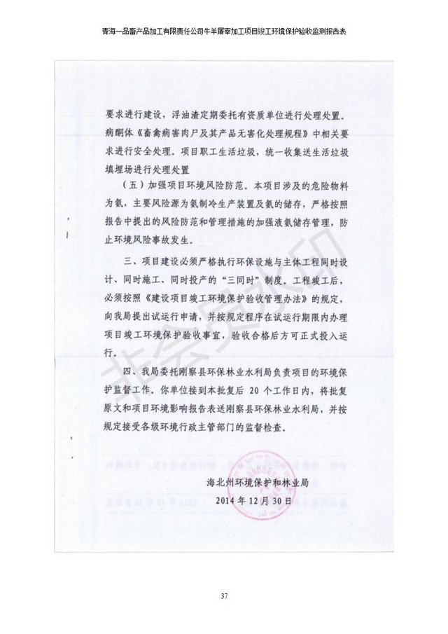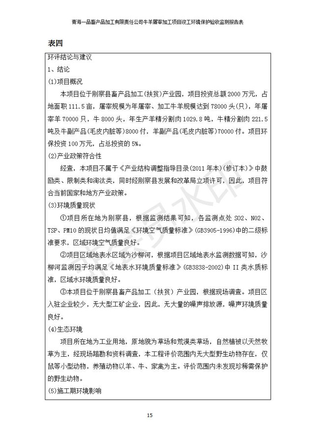 根據(jù)中華人民共和國國務(wù)院令第682號《國務(wù)院關(guān)于修改〈建設(shè)項目環(huán)境保護(hù)管理條例〉的決定》和《建設(shè)項目竣工環(huán)境保護(hù)驗收暫行辦法》(國務(wù)院令682號),青海一品畜產(chǎn)品加工有限責(zé)任公司牛羊屠宰加工項目(包括竣工環(huán)境保護(hù)驗收監(jiān)測報告表和驗收意見)公示如下。 一、項目名稱:青海一品畜產(chǎn)品加工有限責(zé)任公司牛羊屠宰加工項目竣工環(huán)境保護(hù)驗收監(jiān)測報告表 二、地點:剛察縣縣城東大街加油站東側(cè) 三、建設(shè)單位:青海一品畜產(chǎn)品加工有限責(zé)任公司 四、建設(shè)內(nèi)容:項目地面積17453m2,項目建設(shè)內(nèi)容包括牛羊屠宰車間、牛羊肉加工車間、冷庫、辦公區(qū)、污水處理站等。 五、聯(lián)系人:張工 七、公示時間:二〇一九年一月十一日至二〇一九年二月七日 公示期間,對上述公示內(nèi)容如有異議,請以書面形式反饋,個人須署真實姓名,單位須加蓋公章。