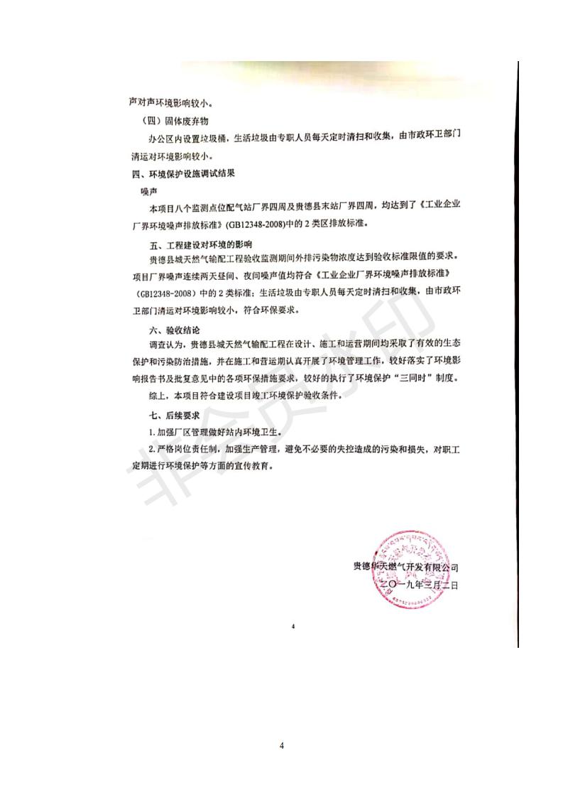 根據(jù)中華人民共和國務(wù)院令第682號《國務(wù)院關(guān)于修改〈建設(shè)項目環(huán)境保護管理條例〉的決定》和《建設(shè)項目竣工環(huán)境保護驗收暫行辦法》(國務(wù)院令682號),貴德縣城輸配管線工程竣工環(huán)境保護驗收內(nèi)容(包括竣工環(huán)境保護驗收調(diào)查表和驗收意見)公示如下。 一、項目名稱:貴德縣城天然氣輸配工程 二、地點:拉雞蓋澀寧蘭復(fù)線22#閥室-貴德縣城 三、建設(shè)單位:貴德華天燃氣開發(fā)有限公司 四、建設(shè)內(nèi)容:貴德縣末站、貴德縣配氣站、貴德縣中壓管網(wǎng)、拉雞蓋22#閥室-貴德縣城長輸管線 五、公示時間:二〇一九年三月十一日至二〇一九年四月八日 六、聯(lián)系人:張工 公示期間,對上述公示內(nèi)容如有異議,請以書面形式反饋,個人須署真實姓名,單位須加蓋公章。
