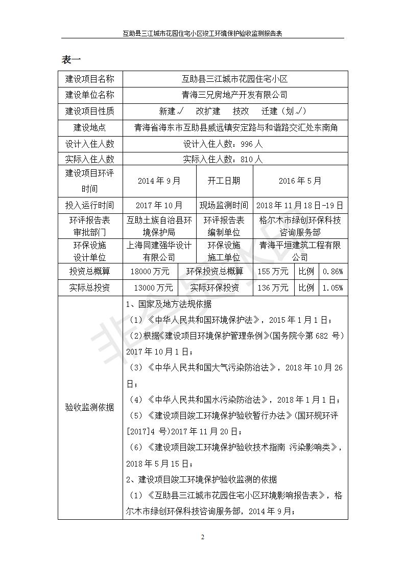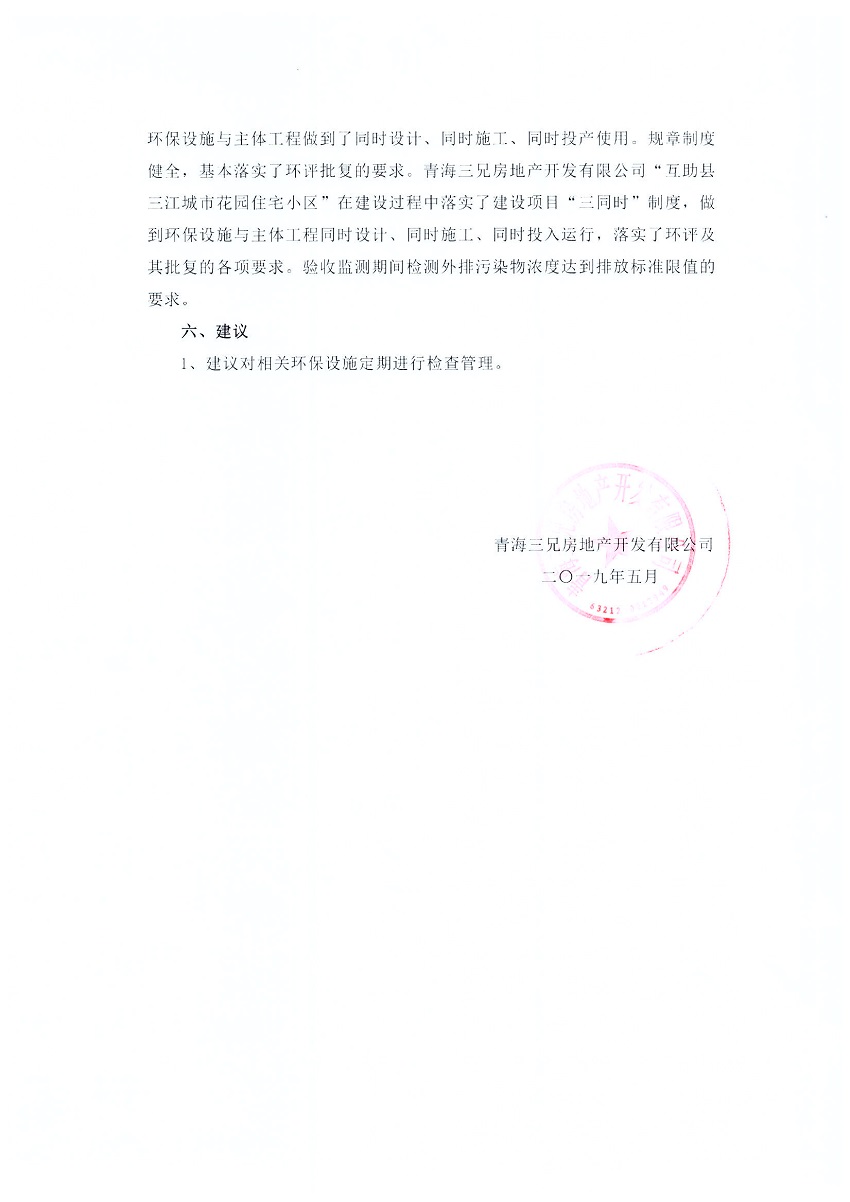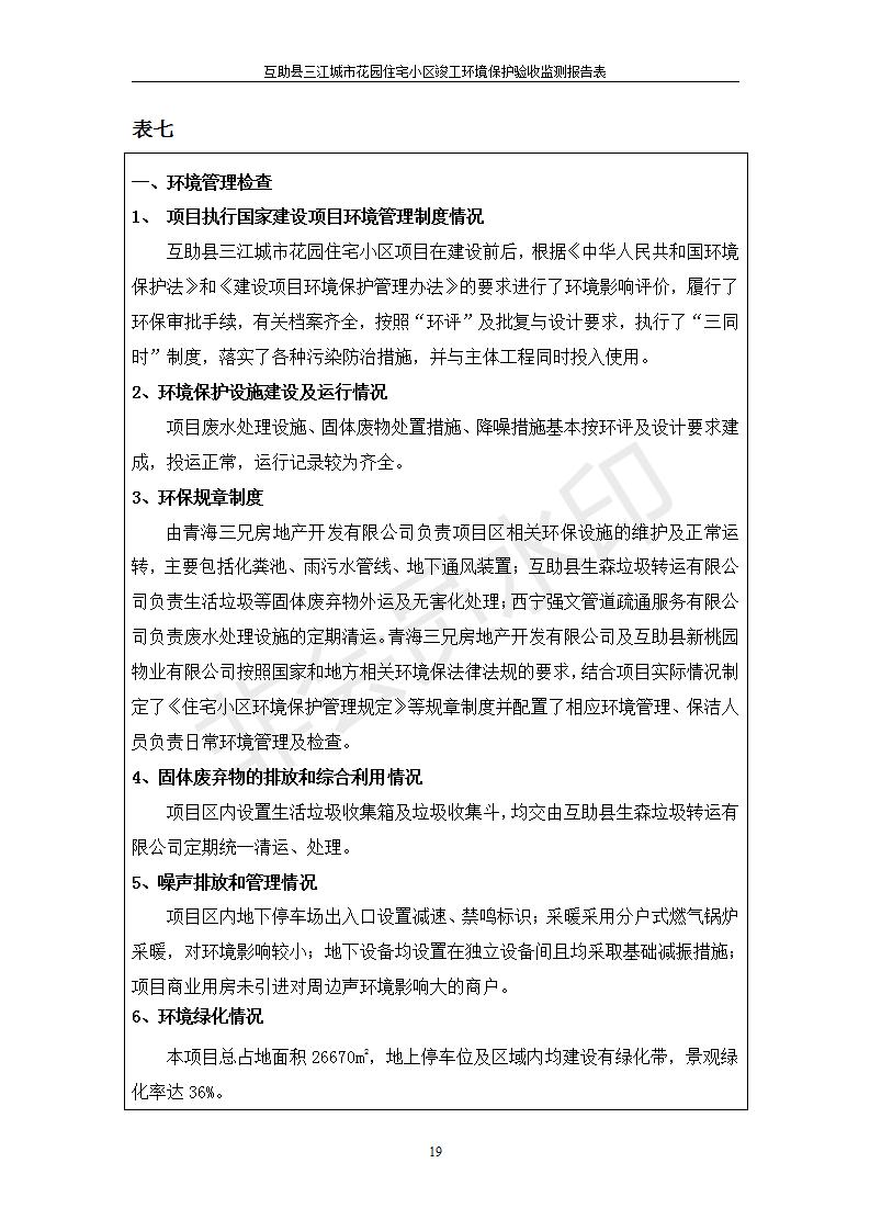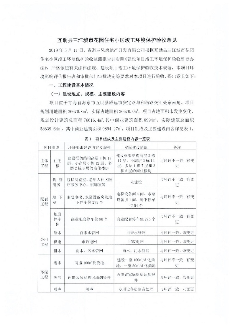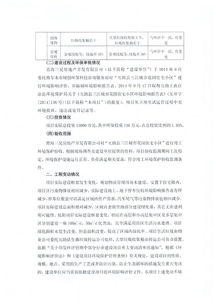 根據中華人民共和國國務院令第682號《國務院關于修改〈建設項目環(huán)境保護管理條例〉的決定》和《建設項目竣工環(huán)境保護驗收暫行辦法》(國務院令682號),互助縣三江城市花園住宅小區(qū)(包括竣工環(huán)境保護驗收監(jiān)測報告表和驗收意見)公示如下。 一、項目名稱: 互助縣三江城市花園住宅小區(qū)竣工環(huán)境保護驗收監(jiān)測報告表 二、地點:青海省海東市互助土族自治縣威遠鎮(zhèn)安定路與和諧路交匯處東南角 三、建設單位:青海三兄房地產開發(fā)有限公司 四、建設內容:項目規(guī)劃用地面積26670.0m2,實際占地面積26670.0m2,項目占地面積未發(fā)生變化,規(guī)劃設計建筑總面積76616.4m2,其中商業(yè)建筑面積8994m2。實際建筑總面積58639.64m2,其中商業(yè)建筑面積9894.27m2。 五、聯(lián)系人:張工 六、聯(lián)系電 話:0971-6515411 七、公示時間:二〇一九年六月五日至二〇一九年七月三日 公示期間,對上述公示內容如有異議,請以書面形式反饋,個人須署真實姓名,單位須加蓋公章。