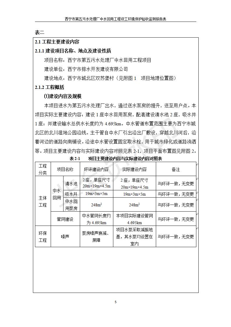 四、建設(shè)內(nèi)容:本項(xiàng)目進(jìn)水為第五污水處理廠出水,通過(guò)送水泵房的提升,送至用戶點(diǎn)。本項(xiàng)目實(shí)際主要建設(shè)內(nèi)容:建設(shè)1座中水回用泵房,配套建設(shè)清水池2座,吸水井1座;并建設(shè)輸水總供水長(zhǎng)度約為4.695km。中水管道布置范圍主要為西寧市城北區(qū)的北川濕地公園沿線。 六、聯(lián)系電 話:0971-6515411 七、公示時(shí)間:二〇一九年七月十日至二〇一九年八月六日 公示期間,對(duì)上述公示內(nèi)容如有異議,請(qǐng)以書(shū)面形式反饋,個(gè)人須署真實(shí)姓名,單位須加蓋公章。