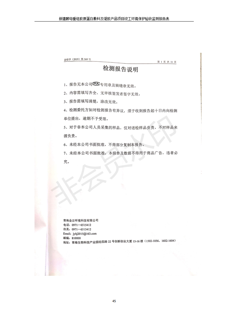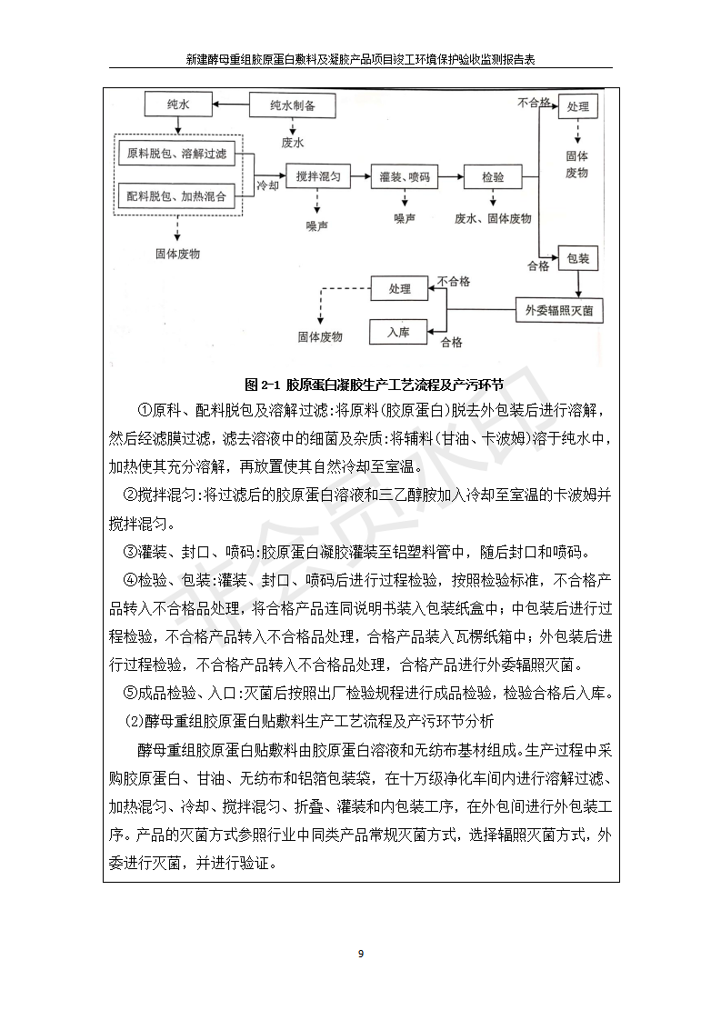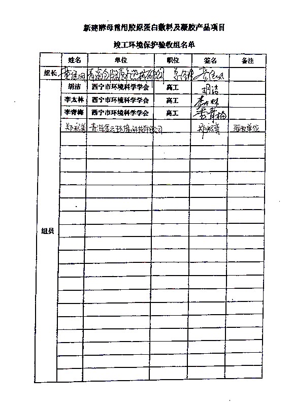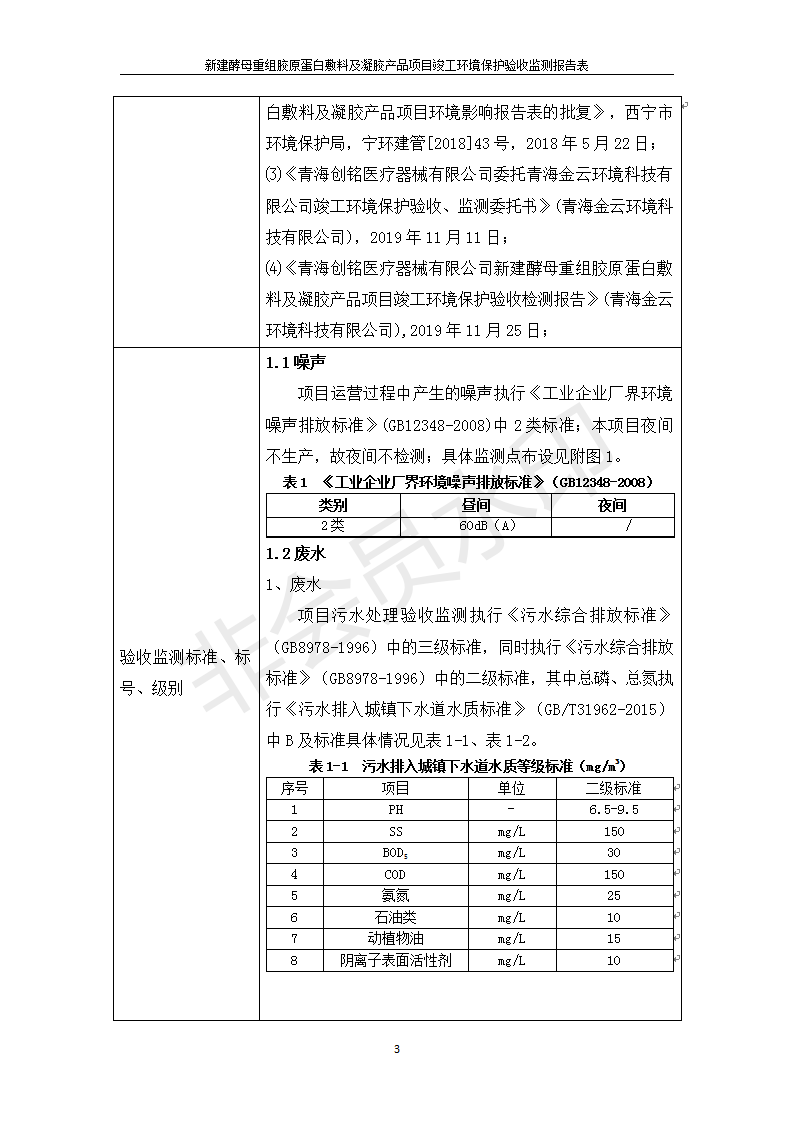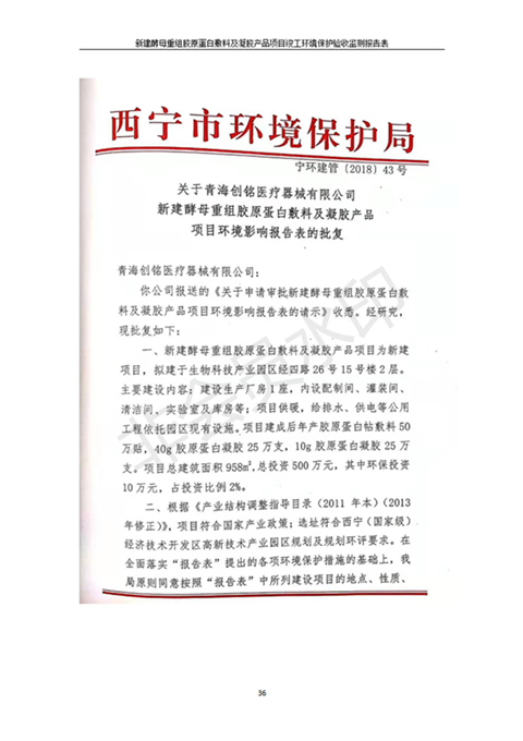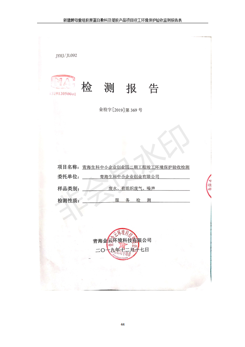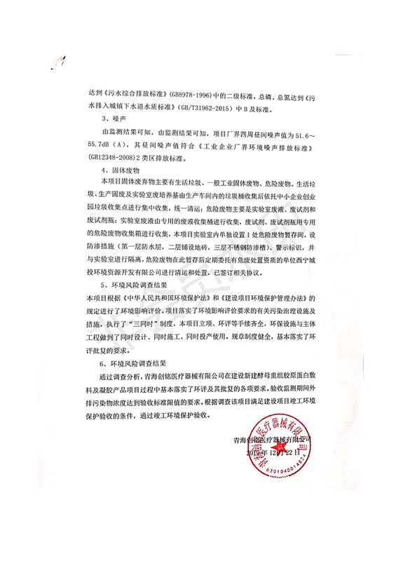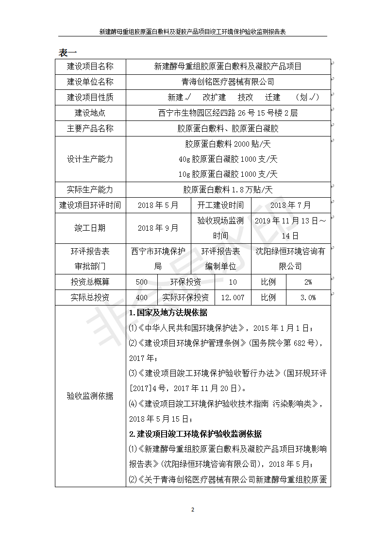 根據(jù)中華人民共和國國務院令第682號《國務院關于修改〈建設項目環(huán)境保護管理條例〉的決定》和《建設項目竣工環(huán)境保護驗收暫行辦法》(國務院令682號),新建酵母重組膠原蛋白敷料及凝膠產(chǎn)品項目(包括竣工環(huán)境保護驗收監(jiān)測報告表和驗收意見)公示如下。 一、項目名稱:新建酵母重組膠原蛋白敷料及凝膠產(chǎn)品項目 二、地點:西寧市生物園區(qū)經(jīng)四路26號15號樓2層 五、聯(lián)系人:董繼風 六、聯(lián)系電話:18606125050 七、公示時間:二〇二〇年一月十三日至二〇二〇年二月十二日 公示期間,對上述公示內容如有異議,請以書面形式反饋,個人須署真實姓名,單位須加蓋公章。