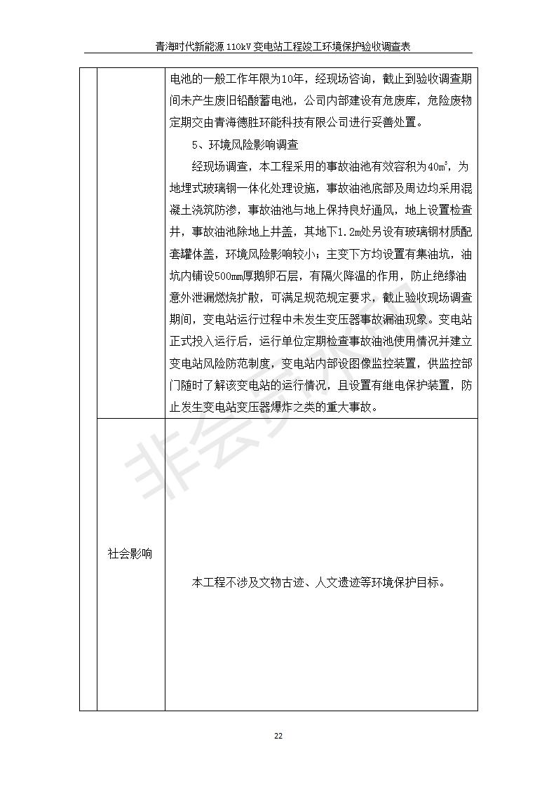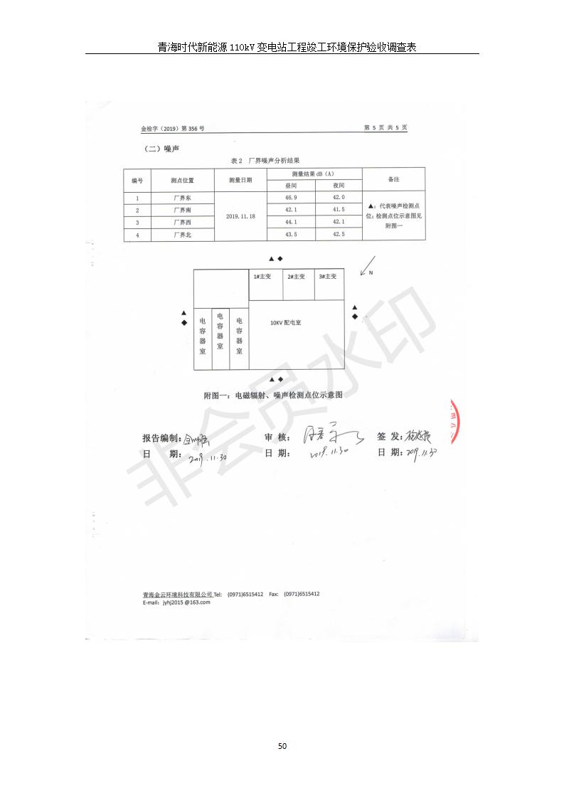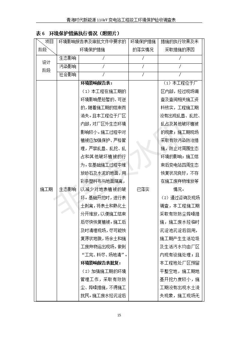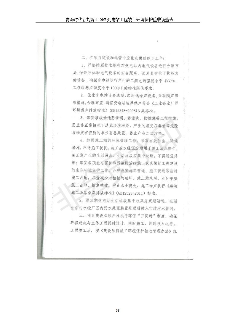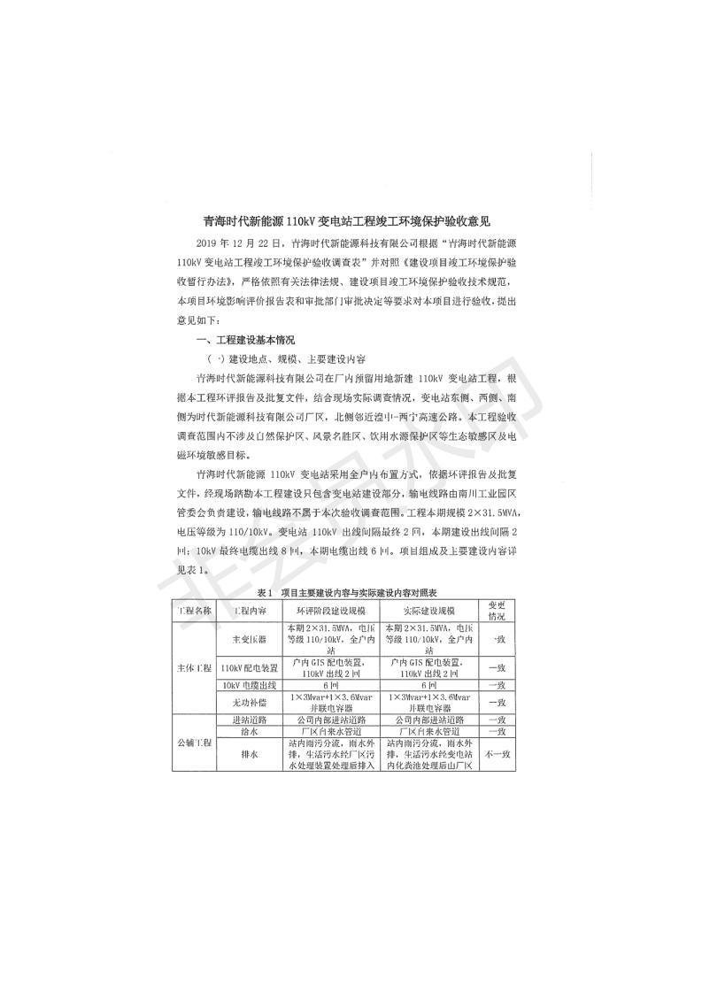 根據(jù)中華人民共和國國務院令第682號《國務院關于修改〈建設項目環(huán)境保護管理條例〉的決定》和《建設項目竣工環(huán)境保護驗收暫行辦法》(國務院令682號),青海時代新能源110kV變電站工程(包括竣工環(huán)境保護驗收調(diào)查表和驗收意見)公示如下。 一、項目名稱:青海時代新能源110kV變電站工程 二、地點:青海省西寧市南川工業(yè)園區(qū)創(chuàng)業(yè)路182號青海時代新能源科技有限公司廠區(qū)內(nèi) 三、建設單位:青海時代新能源科技有限公司 四、建設內(nèi)容:青海時代新能源 110kV 變電站采用全戶內(nèi)布置方式,依據(jù)環(huán)評報告及批復文件,經(jīng)現(xiàn)場踏勘本工程建設只包含變電站建設部分,輸電線路由南川工業(yè)園區(qū)管委會負責建設,輸電線路不屬于本次驗收調(diào)查范圍。工程本期規(guī)模2×31.5MVA,電壓等級為110/10kV。變電站 110kV 出線間隔最終2回,本期建設出線間隔2回;10kV最終電纜出線8回,本期電纜出線6回。 五、聯(lián)系人:張工 六、聯(lián)系電話:0971-6515411 七、公示時間:二〇二〇年一月十四日至二〇二〇年二月十三日 公示期間,對上述公示內(nèi)容如有異議,請以書面形式反饋,個人須署真實姓名,單位須加蓋公章。